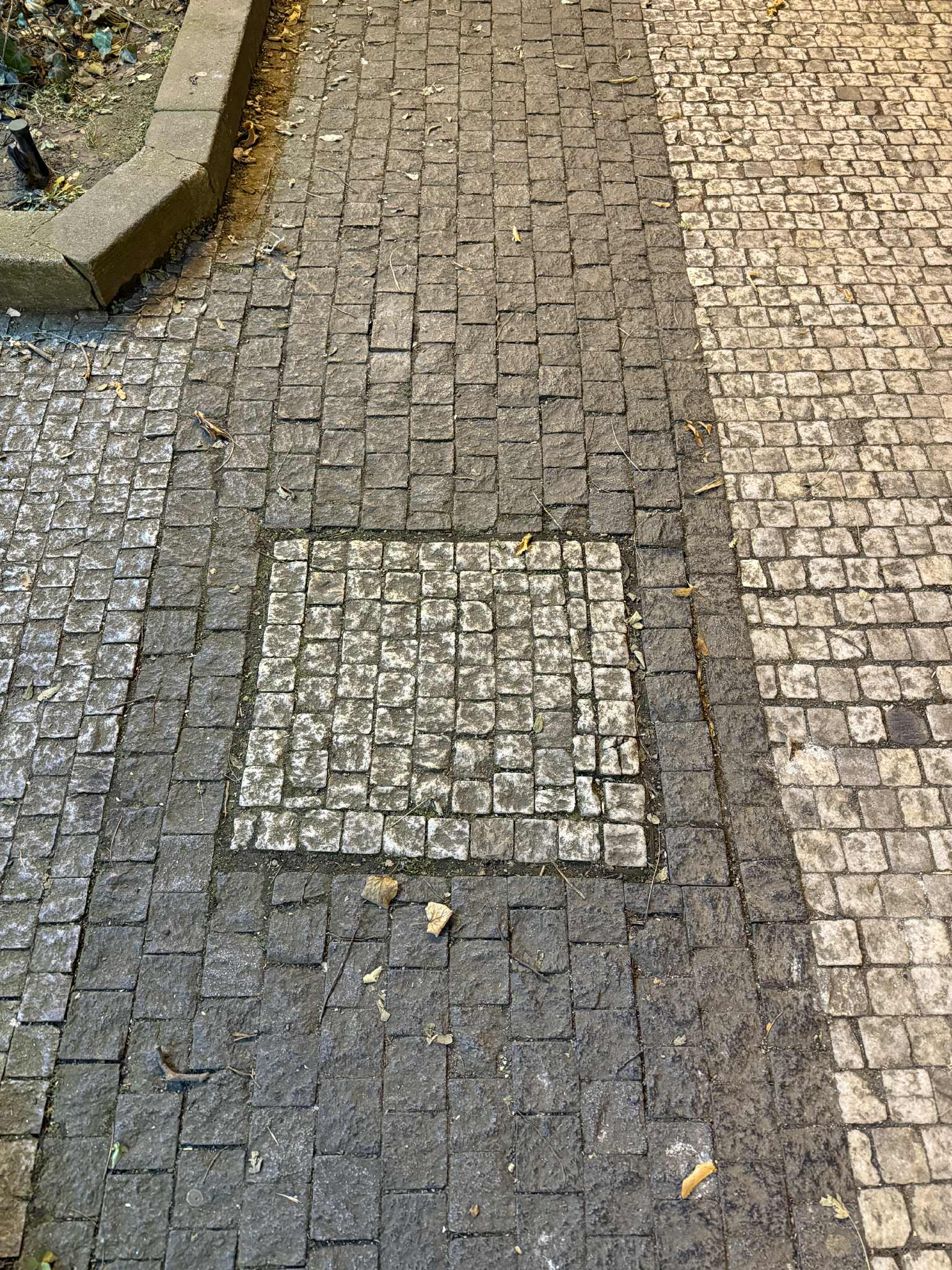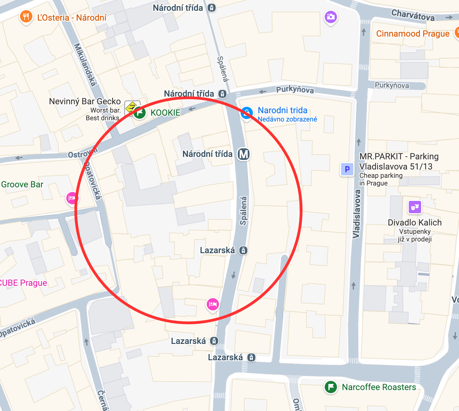 Projděte zahradou k Národnímu filmovému muzeu. Postavte se na čtverec na fotce. Při chůzi nejpřímější možnou trajektorií, kolik kroků je vzdálena brána na Jungmannovo náměstí? |